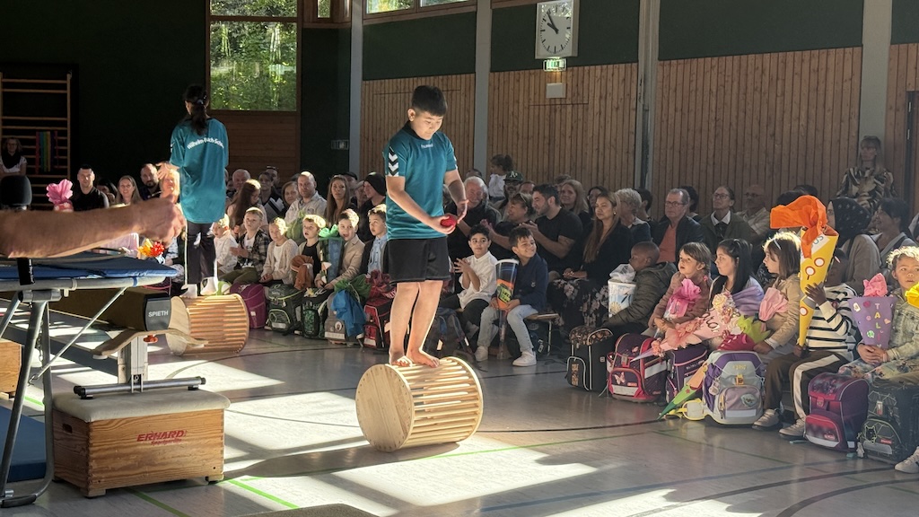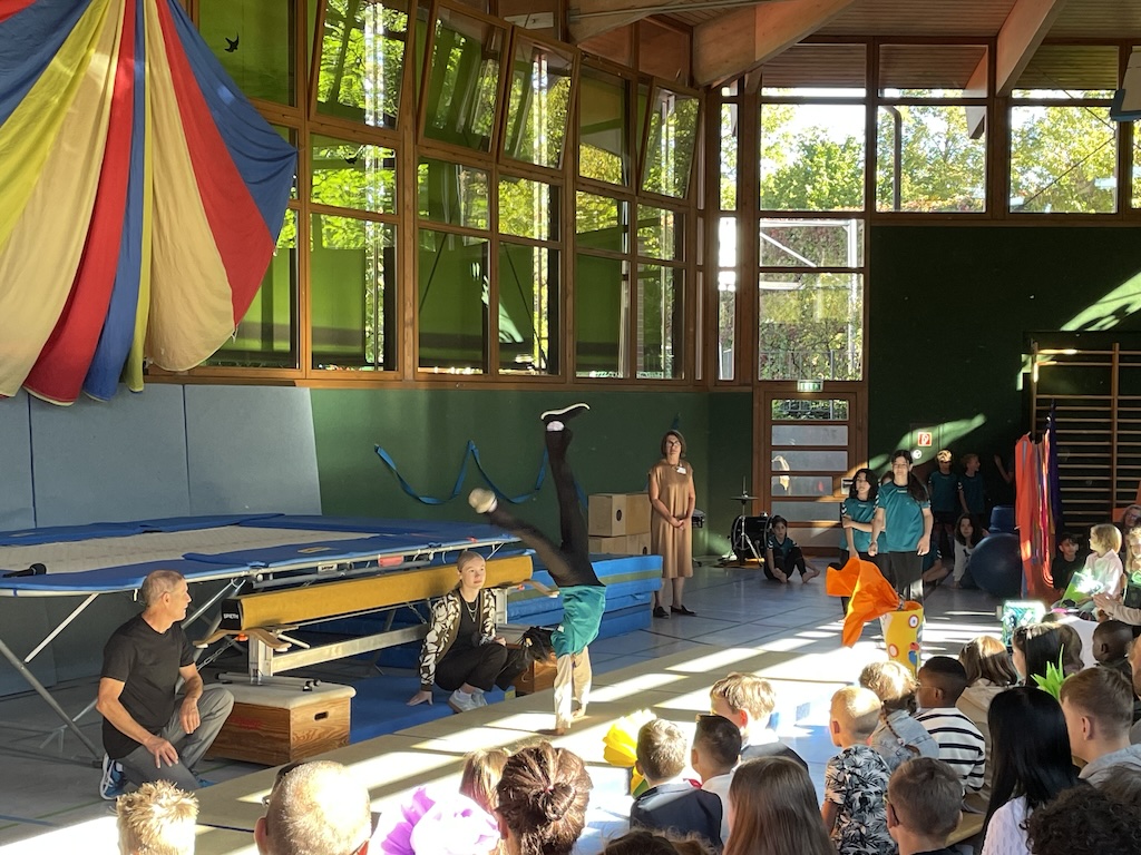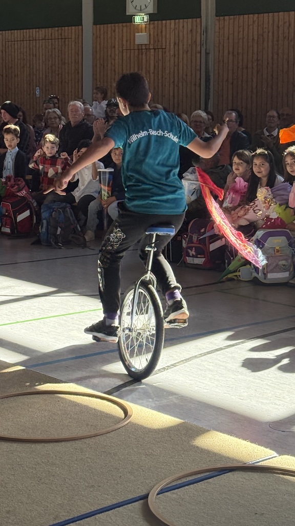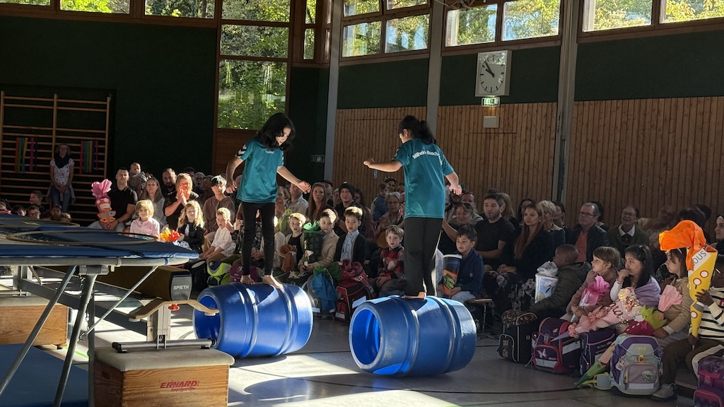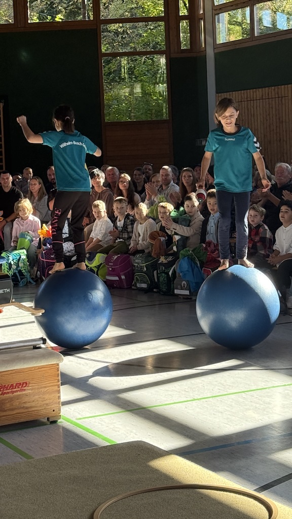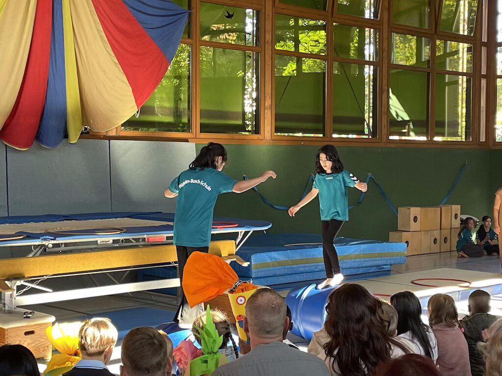 Vorne in der ersten Reihe saßen die 26 stolzen neuen Schulkinder, ausgestattet mit bunten Schulranzen und wunderschönen Schultüten. Nach einer kurzen Begrüßung durch die Schulleiterin Frau Schlenger stürmten die restlichen Kinder der Schule samt ihren Lehrerinnen die Halle. Mit dem Lied „Unsre Schule, die ist bunt“ hießen sie die neuen Erstklässlerinnen und Erstklässler an der Wilhelm-Busch-Schule willkommen. Anschließend folgte eine kurze Vorführung der letztjährigen Trommel-AG und die Klasse 6 führte einen schwungvollen Rap vor. Nun ging es sportlich weiter im Programm: Die Zirkuskinder zeigten unter der Leitung von Frau Schlenger und Sportlehrer Herrn Schober ihr Können und ernteten viel Applaus. Abgerundet wurde die Vorführung von den Klassen 2a und 2b mit dem Körperteil-Blues.