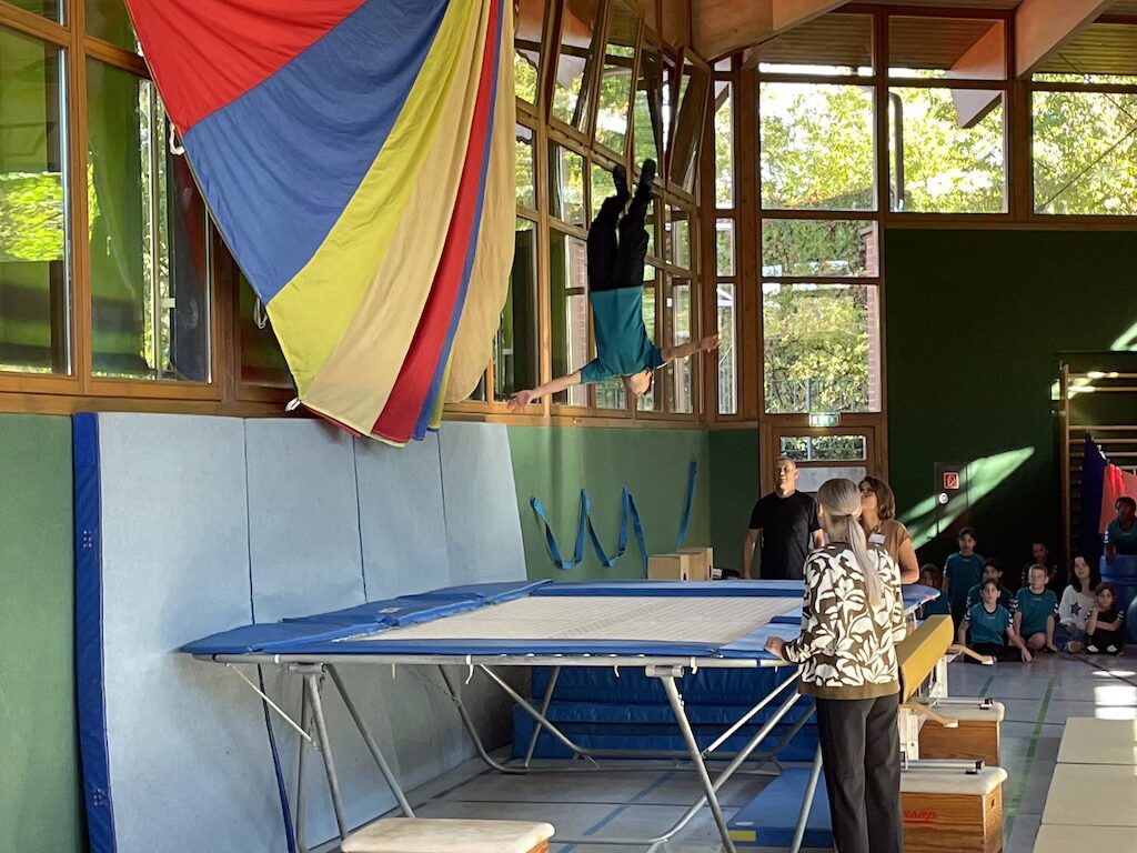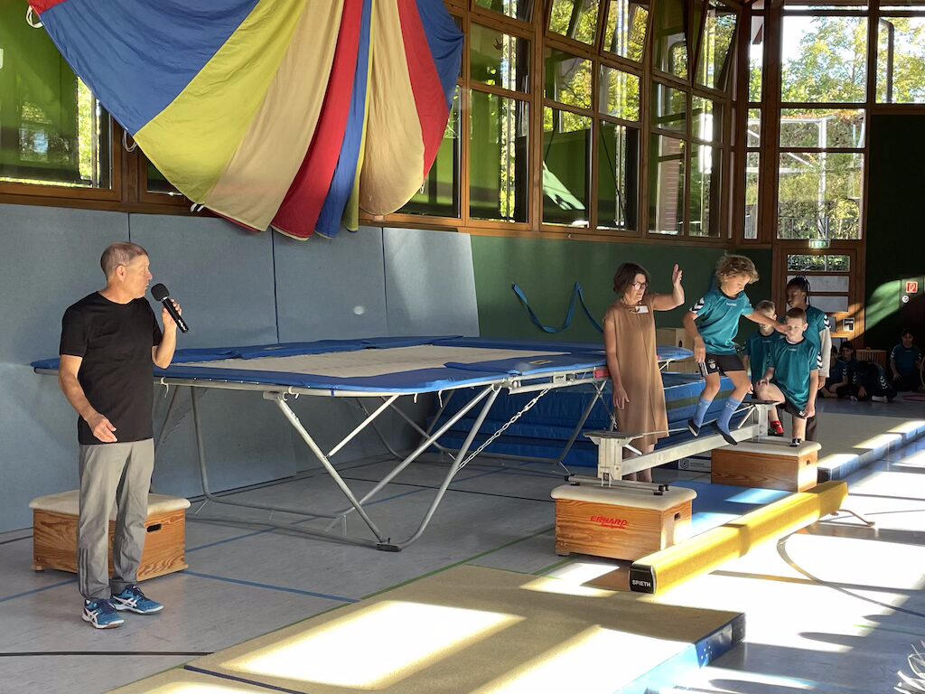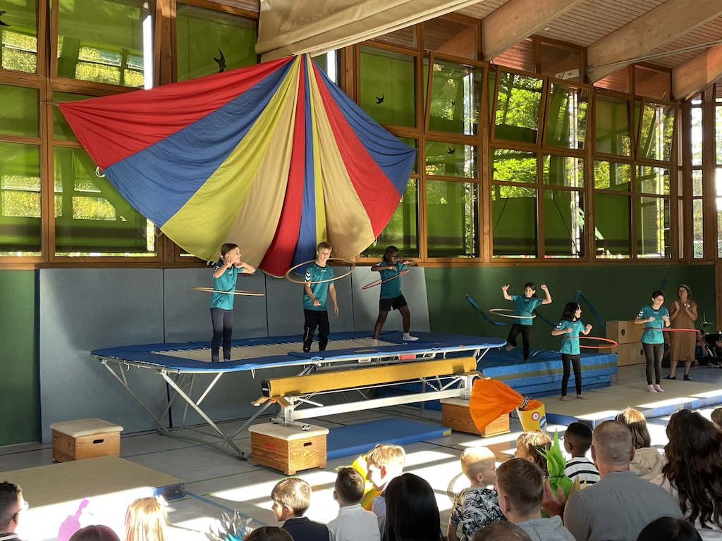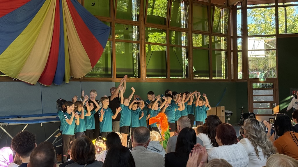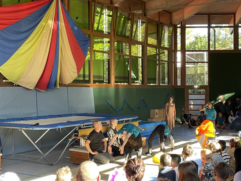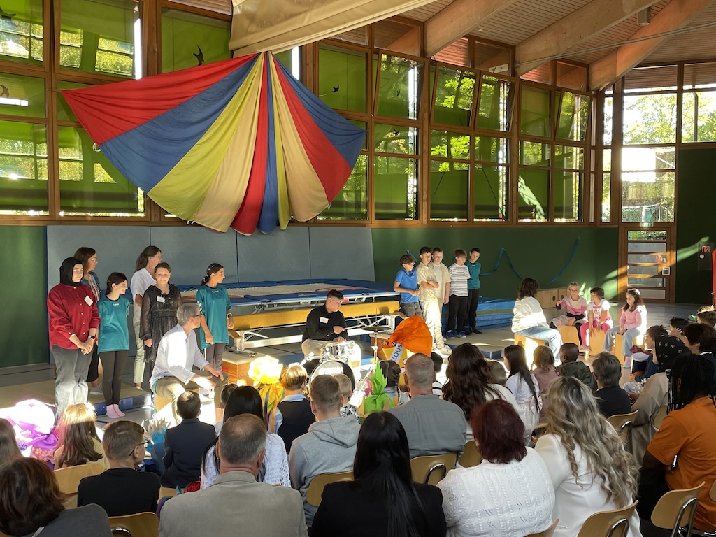 Vorne in der ersten Reihe saßen die 26 stolzen neuen Schulkinder, ausgestattet mit bunten Schulranzen und wunderschönen Schultüten. Nach einer kurzen Begrüßung durch die Schulleiterin Frau Schlenger stürmten die restlichen Kinder der Schule samt ihren Lehrerinnen die Halle. Mit dem Lied „Unsre Schule, die ist bunt“ hießen sie die neuen Erstklässlerinnen und Erstklässler an der Wilhelm-Busch-Schule willkommen. Anschließend folgte eine kurze Vorführung der letztjährigen Trommel-AG und die Klasse 6 führte einen schwungvollen Rap vor. Nun ging es sportlich weiter im Programm: Die Zirkuskinder zeigten unter der Leitung von Frau Schlenger und Sportlehrer Herrn Schober ihr Können und ernteten viel Applaus. Abgerundet wurde die Vorführung von den Klassen 2a und 2b mit dem Körperteil-Blues.