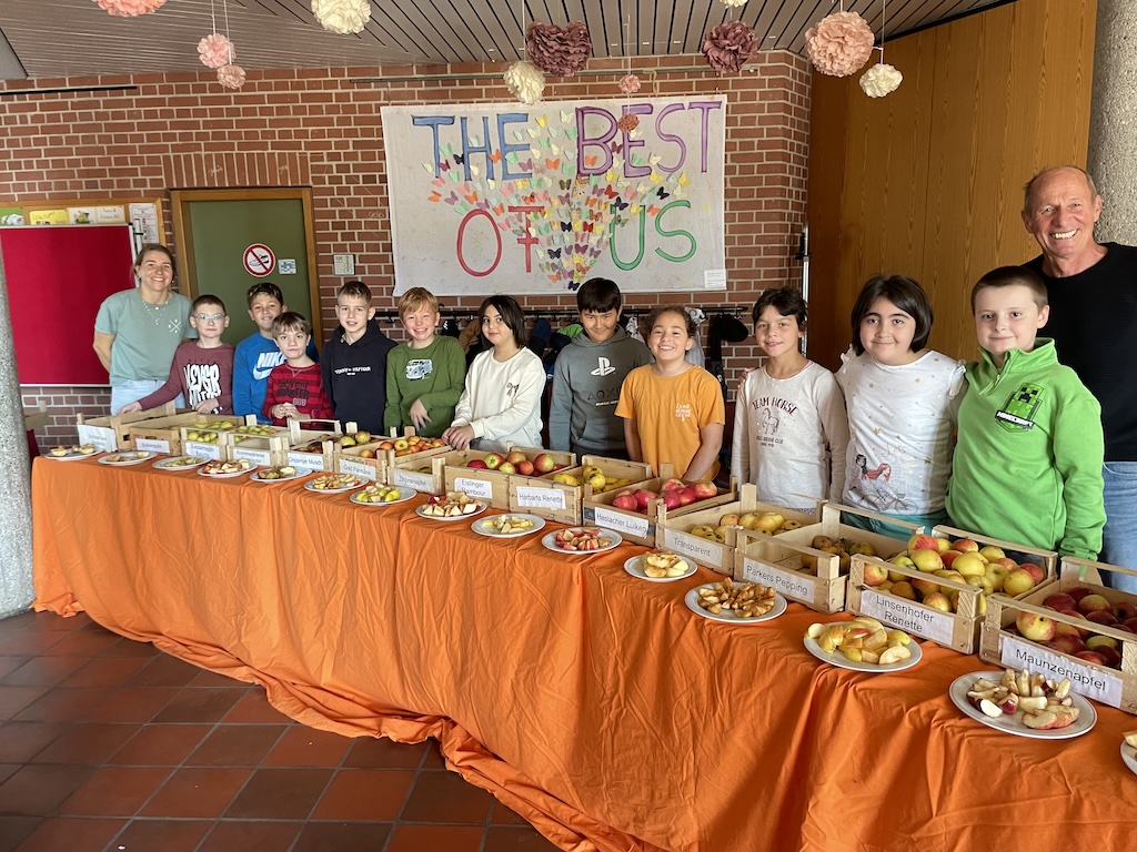 Bei der Apfelsaftausstellung der Klasse 4b konnte die ganze Schulgemeinschaft 25 verschiedene Apfelsorten testen und ihren Lieblingsapfel wählen: den „Kardinal Bea“.