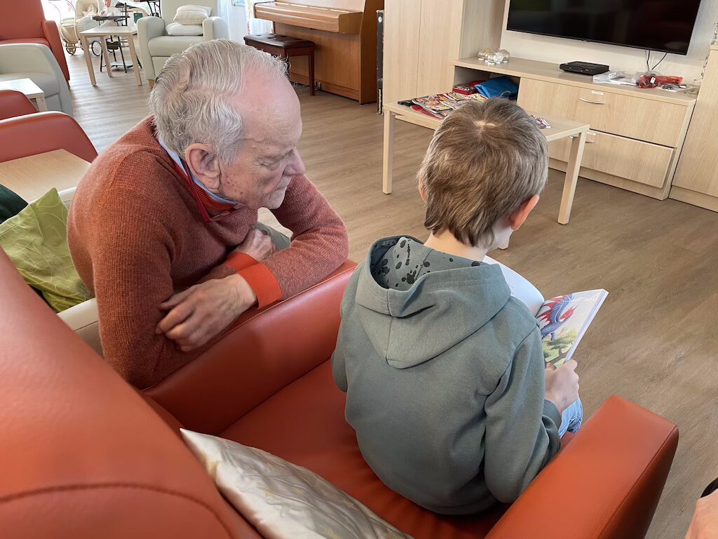 Immer vier Kinder machten sich in der 3. Stunde zusammen mit unserer FSJ-lerin Frau Jentsch auf den Weg zur Senioren-Tagespflegegruppe im Sternquartier. Im Gepäck verschiedene Bücher oder Texte, die sich die Kinder zum Vorlesen ausgesucht hatten. Im Sternquartier angekommen wurden sie freudig von den anwesenden Senioren begrüßt, die die Kinder schon erwartet hatten. Jedes Kind suchte sich dann zusammen mit einer Zuhörerin oder einem Zuhörer einen gemütlichen Platz zum Lesen aus.