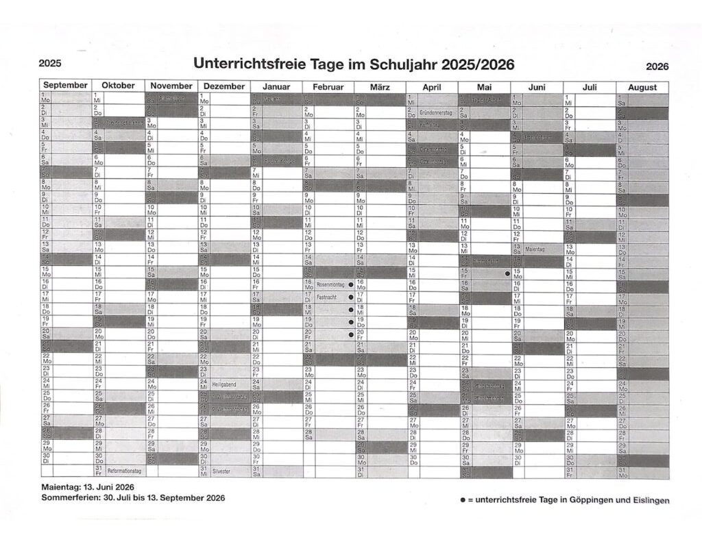- 20. Dezember 2025 – 6. Januar 2026: Weihnachtsferien