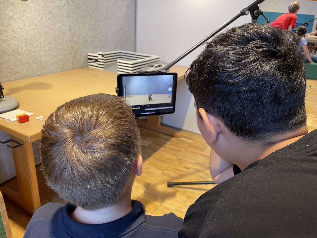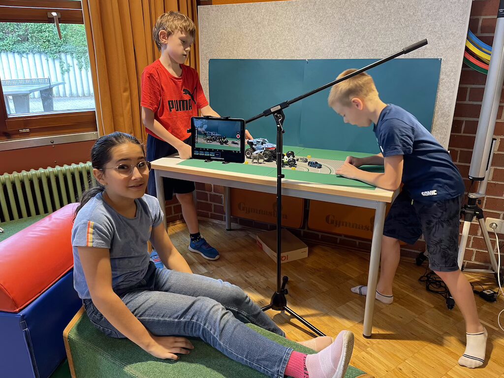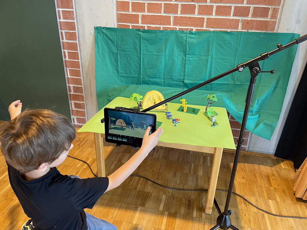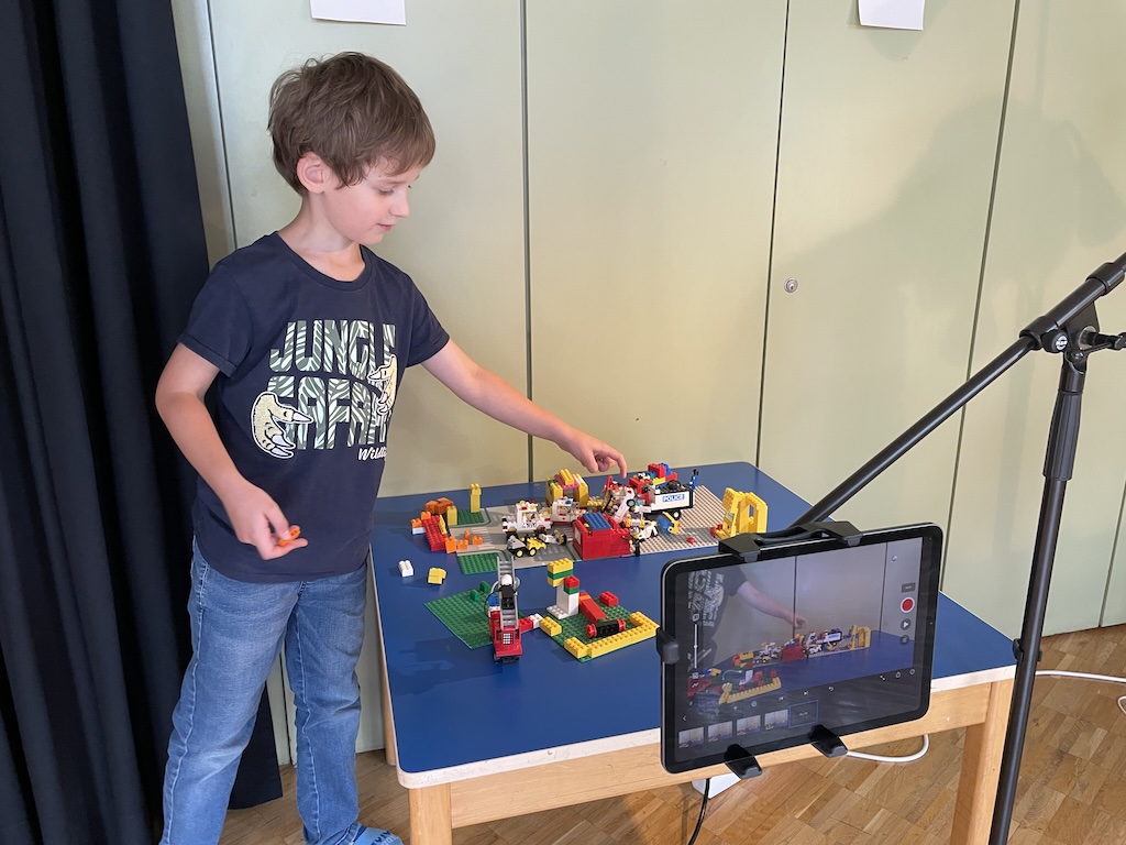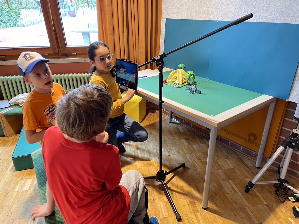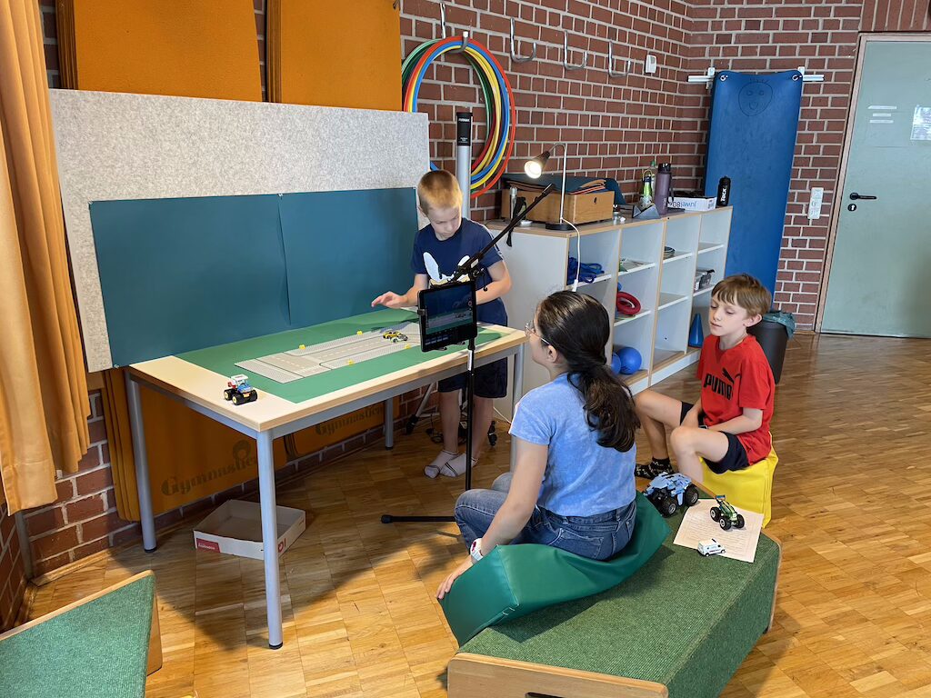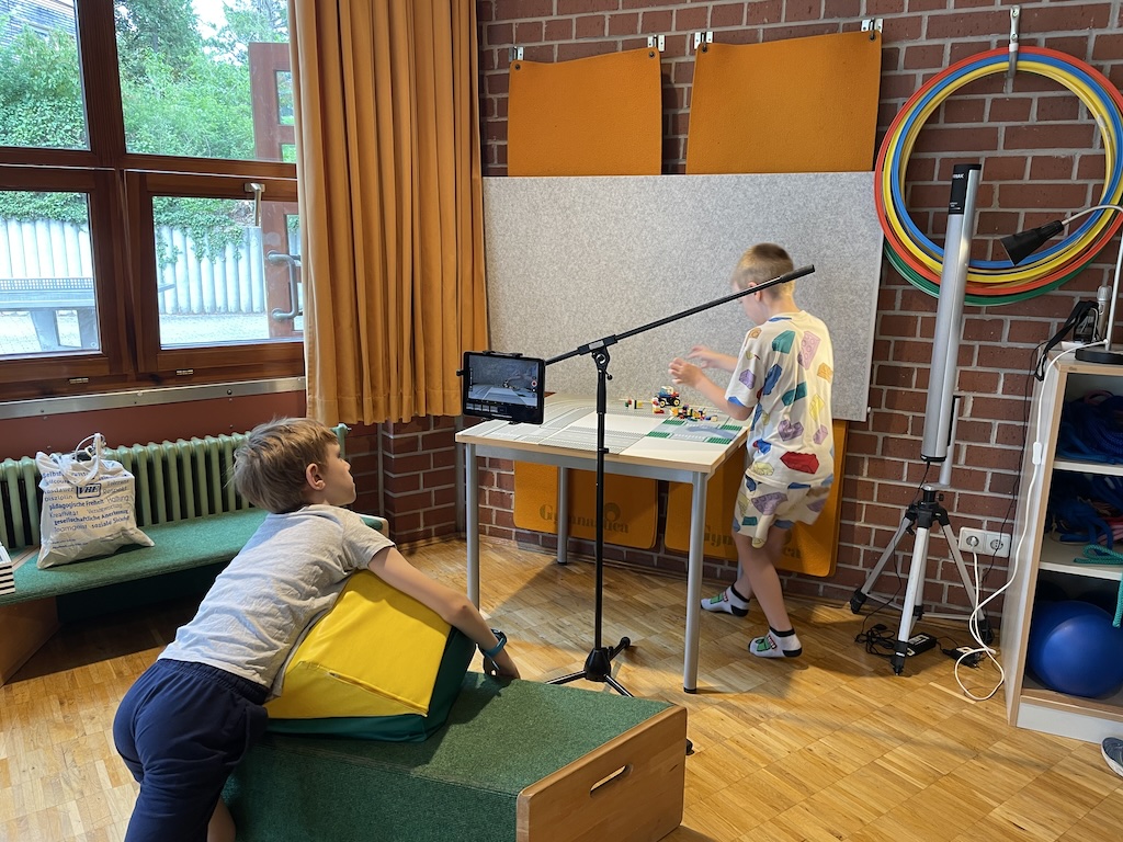 Wir richteten im Rhythmikraum unser Filmstudio ein und machten uns mit der App „Stop Motion Studio“ vertraut. Dann ging es erst einmal ans Ausprobieren und wir nahmen die ersten Probefilme auf. Beim gemeinsamen Anschauen unserer Versuchsvideos merkten wir schnell, was beim Filmen wichtig ist und worauf wir in den nächsten Tagen achten sollten.
