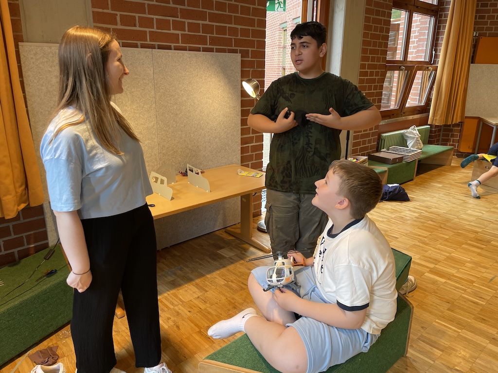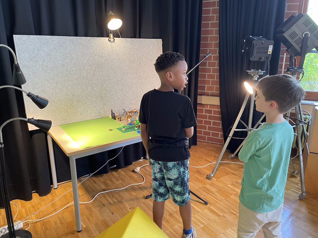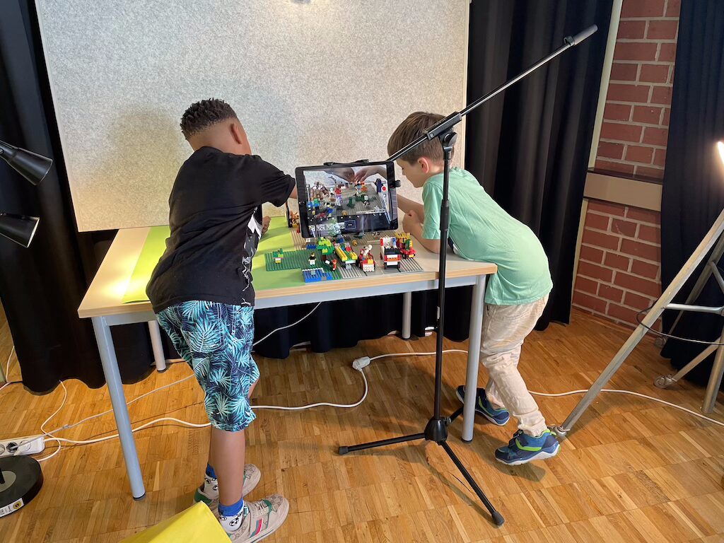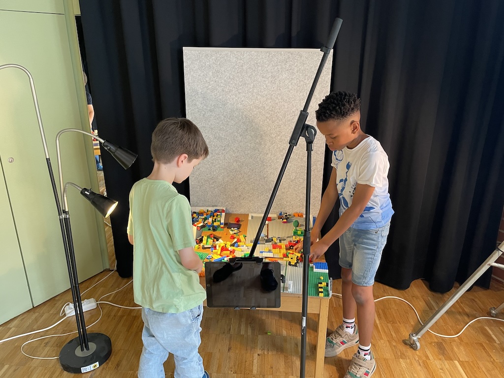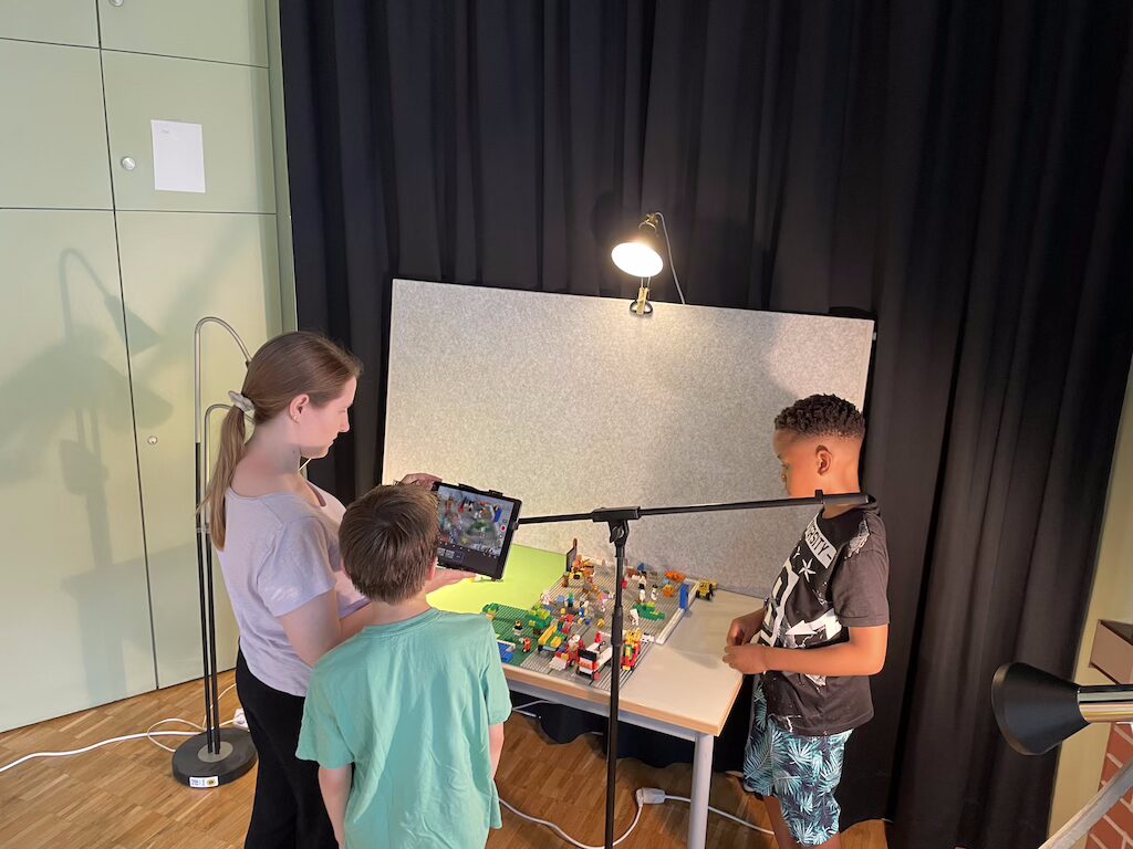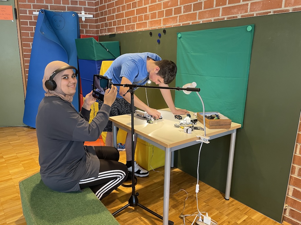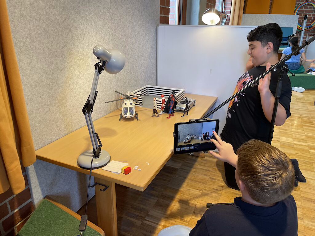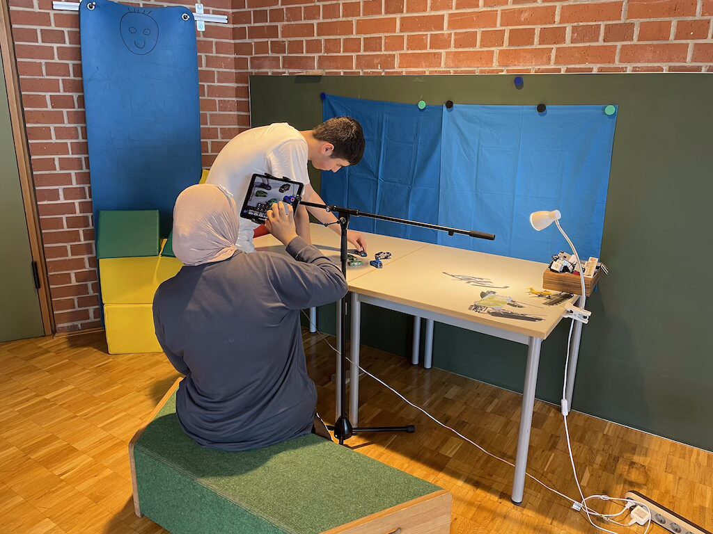 Wir richteten im Rhythmikraum unser Filmstudio ein und machten uns mit der App „Stop Motion Studio“ vertraut. Dann ging es erst einmal ans Ausprobieren und wir nahmen die ersten Probefilme auf. Beim gemeinsamen Anschauen unserer Versuchsvideos merkten wir schnell, was beim Filmen wichtig ist und worauf wir in den nächsten Tagen achten sollten.